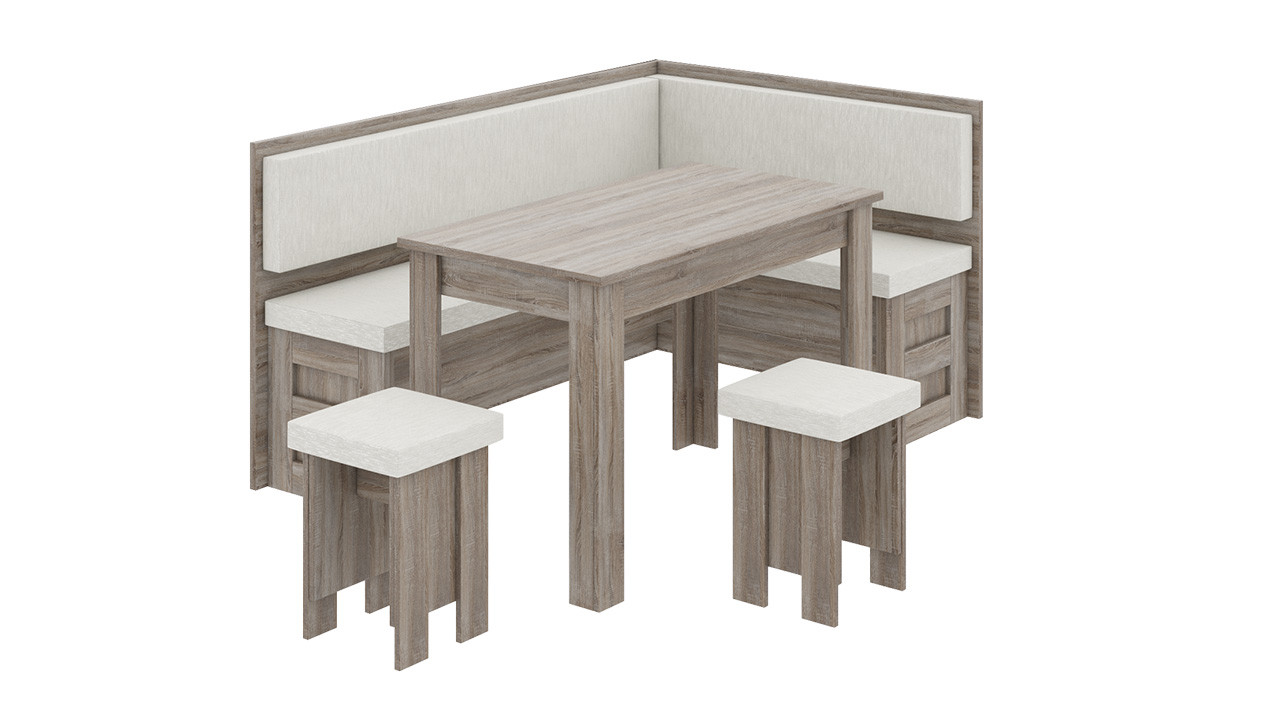 • Обеденная зона "Норд" состоит из удобной угловой скамьи, практичного стола и компактных табуретов.